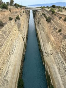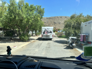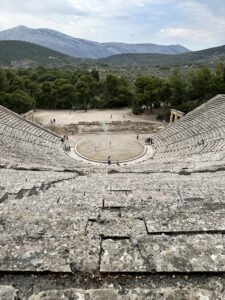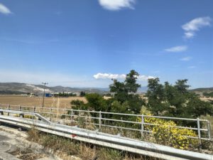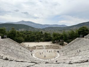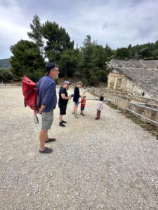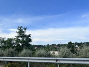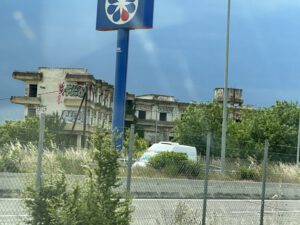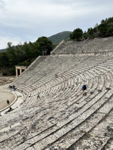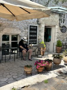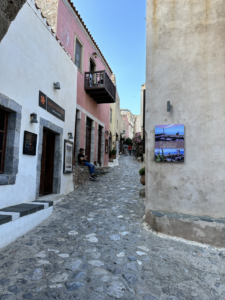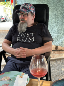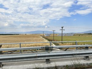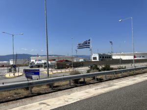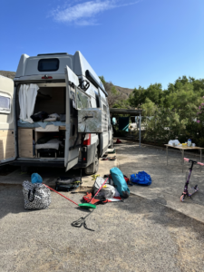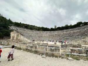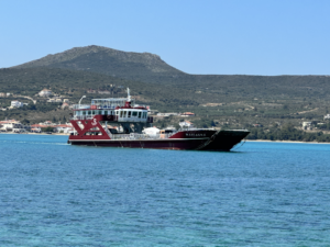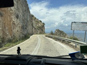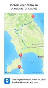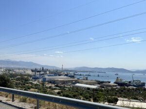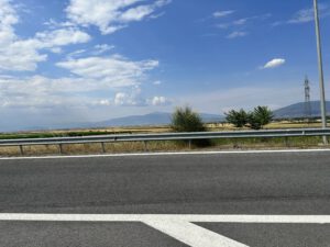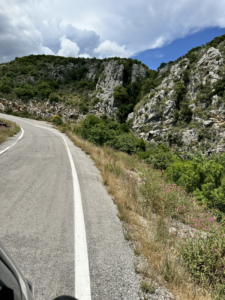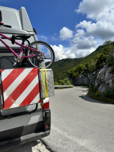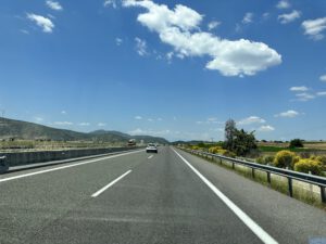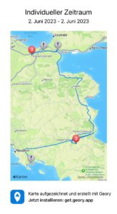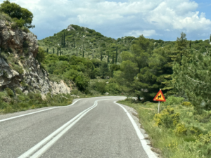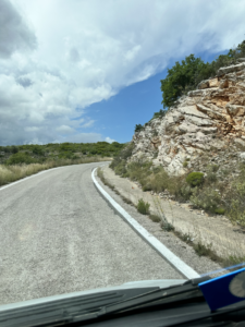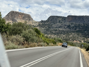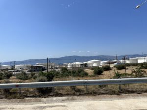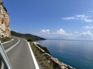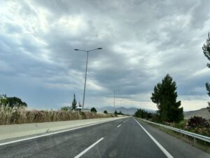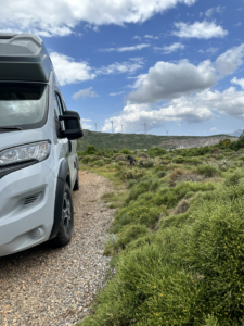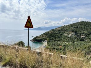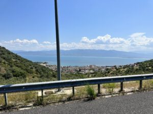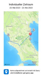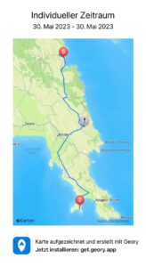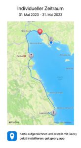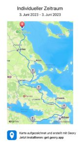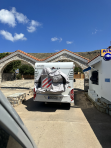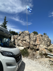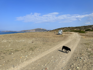Musik in Disko-Lautstärke von links (Pop), von vorne (griechischer Rap), von rechts (griechische Rockmusik) und irgendwann auch noch von hinten (traditionelle Musik) erzeugen einen Geräuschpegel, der selbst für unsere todmüde Eva und den Hund das Schlafen unmöglich macht. Konzentration für Blog-Einträge kann nicht aufgebaut werden, immerhin versucht Michael noch die Bilder und Videos zu bearbeiten, was er aber irgendwann genervt abbricht, da das WLAN durch die diversen Download-Streams der Feiernden einfach unerträglich langsam ist. Der Stellplatznachbar, ein älterer Belgier, packt als letzter verbliebender Camper außer unserer Käte, genervt um 10 Uhr abends im Pyjama seinen Bus und fährt vom Platz.