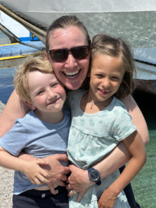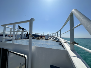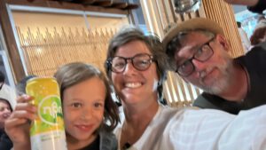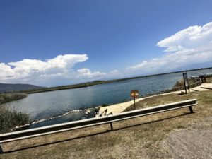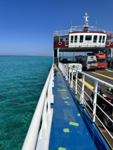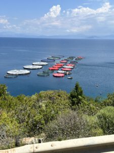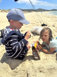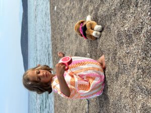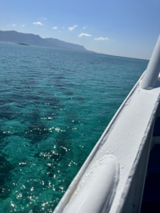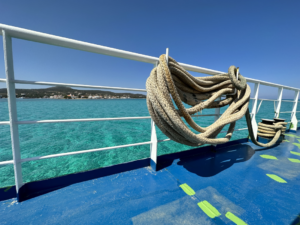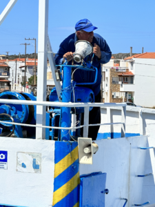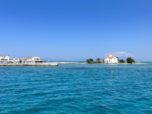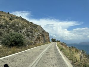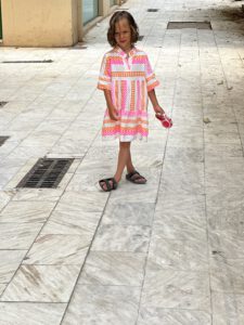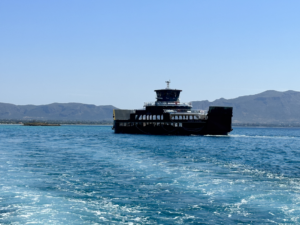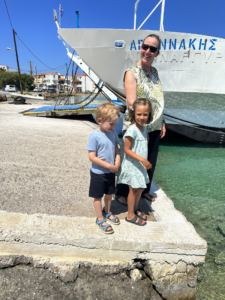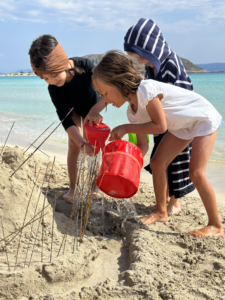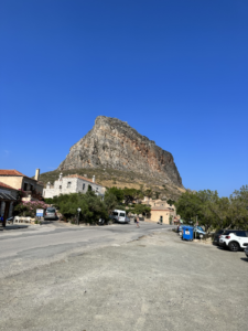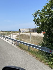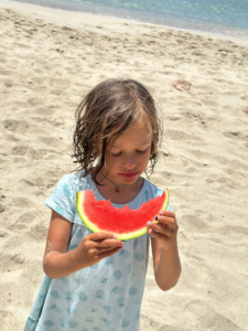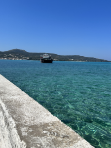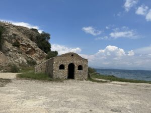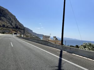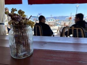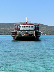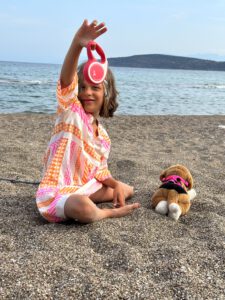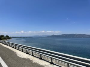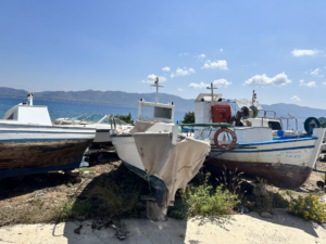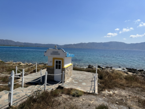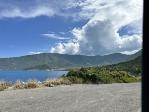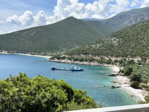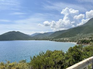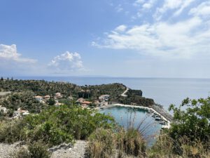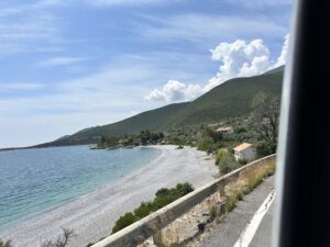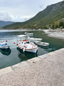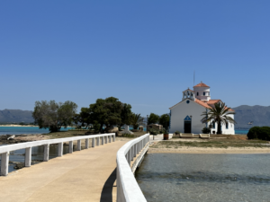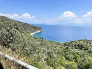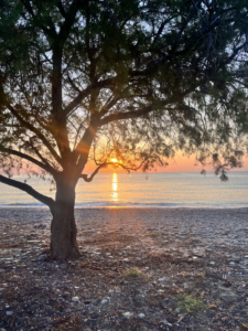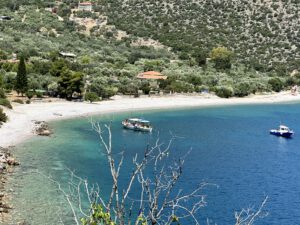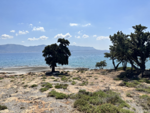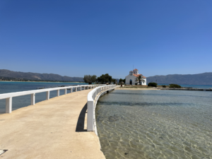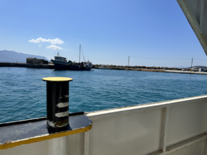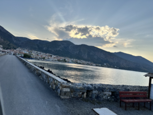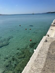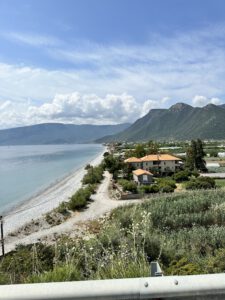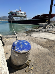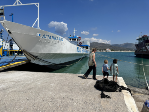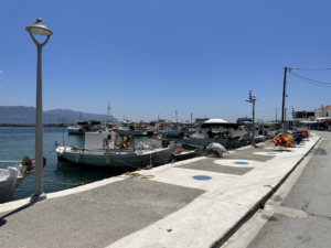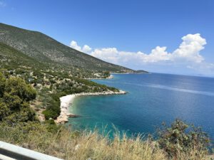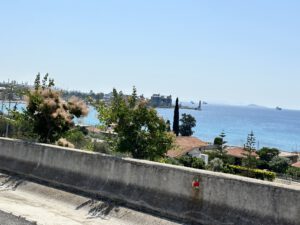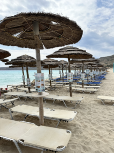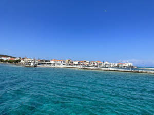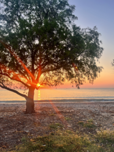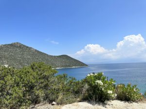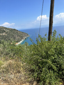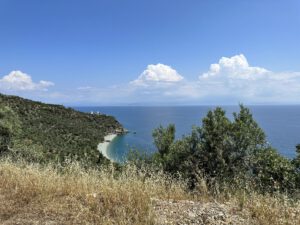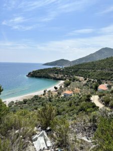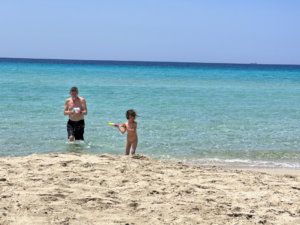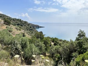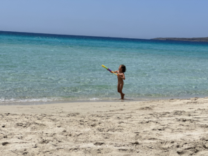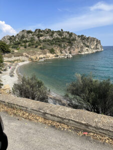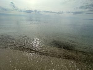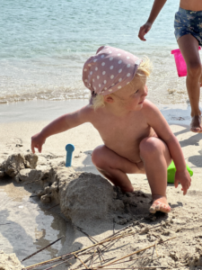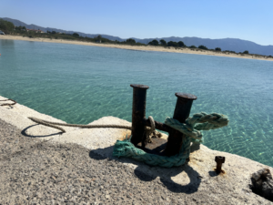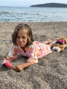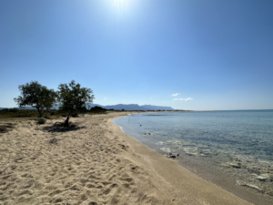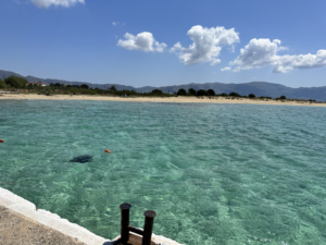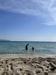In jedem Fall ist das ein Tag für süßes Nichtstun, Strand, Schwimmen, Frappé und Eis. Also packen wir nach einem kurzen Frühstück unsere Sachen und gehen kurzerhand ans Meer. Herrlich, auch wenn das Wasser nicht ganz so klar ist, wie an unseren bisherigen Stränden, warm ist es allemal. Nur der Wind sorgt dafür, dass wir unser Sonnensegel nicht aufstellen können, was die Badezeit etwas verkürzt, denn die Sonne brennt ganz schön runter.