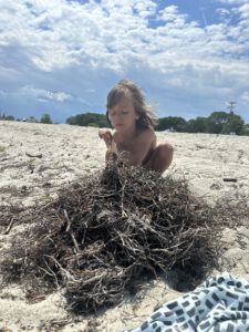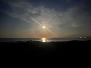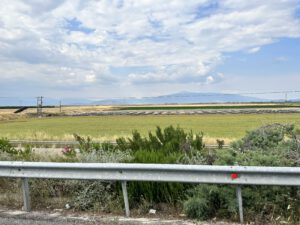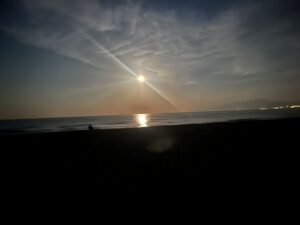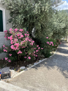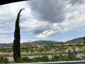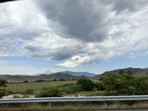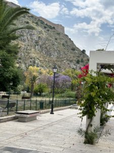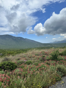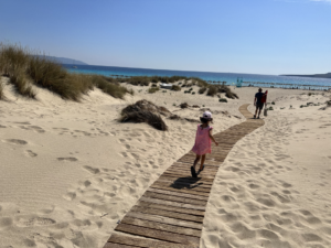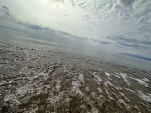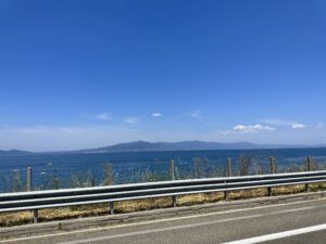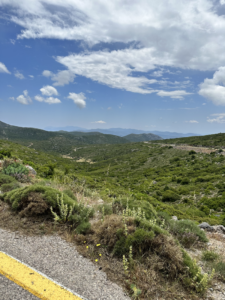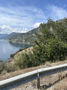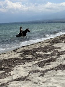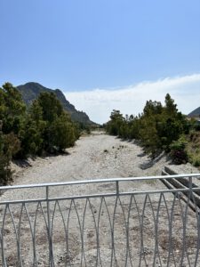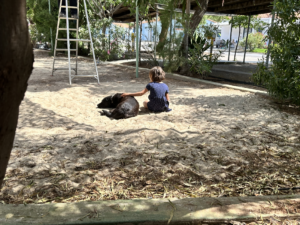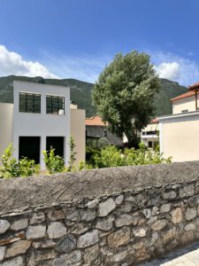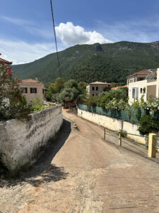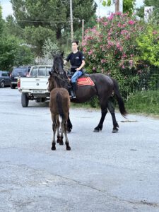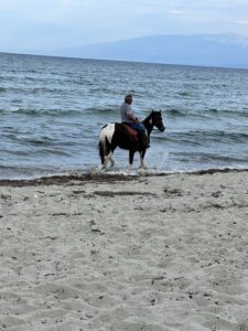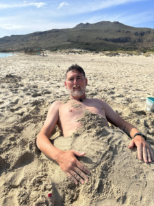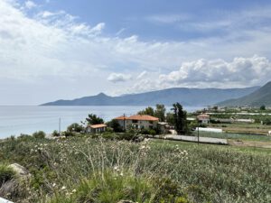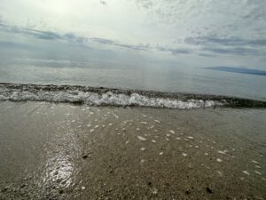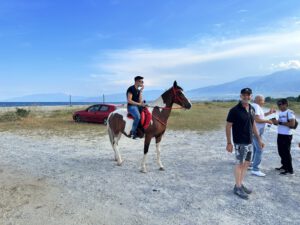 Es ist ein irrer Kontrast am Strand zu liegen, von Hund und Kind mit Sand beworfen zu werden, um uns herum Pferden beim Baden und Strandritt zuzusehen, ins Meer zum Schwimmen zu gehen und gleichzeitig in „Armeslänge“ den Olymp mit schneebedeckten Gipfeln zu sehen, über dem sich schneeweiße Wolken in skurrilen Formen auftürmen.