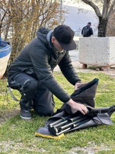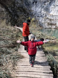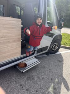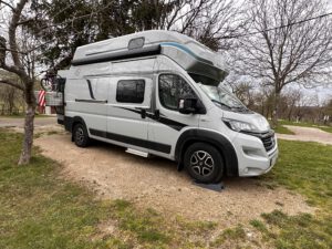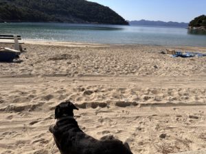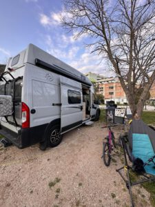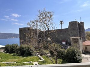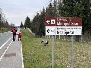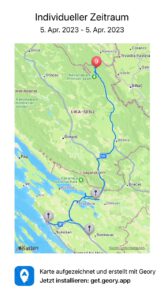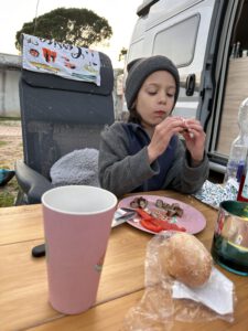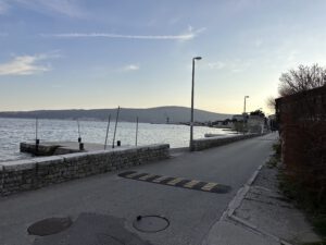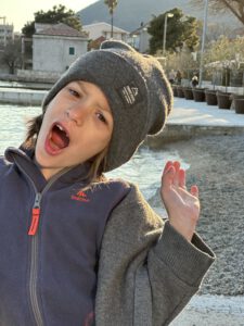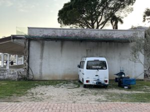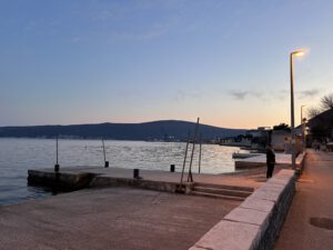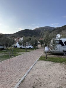 Der erste Campingplatz, den wir ansteuern wollen, liegt kurz hinter der Grenze. Ziel ist es für 2-3 Tage zu verweilen, damit der Osterhase uns auch sicher findet. Kurz hinter Herceg Novi im kleinen Städtchen Bijela liegt der Campingplatz Zlokovic. Wir werden freundlich empfangen, aber schnell ist klar, das ist hier nichts für uns. Direkt an der Strandpromenade gelegen, an der v.a. die Senioren ihre Runden drehen, hat das Örtchen und der Platz sicherlich für manche Urlauber Charme, aber für Luna keinen Platz für ihr Geschäft. Uns gegenüber steht ein kleiner Mazda mit zwei Japanern, die Ersatzreifen dabei, scheinen sie den ganzen weg bis hierher gefahren zu sein – Respekt, in dem Auto hätte nicht mal einer von uns Platz!