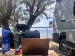 Mit Blick aufs Meer und der Sonne im Gesicht, lässt es sich für Michael heute deutlich leichter arbeiten, als anderorts. Eva ist mehr oder weniger den ganzen Vormittag verschwunden und spielt mit ihrer neuen schweizer Freundin, also Zeit für Hausarbeit und Faulenzen.