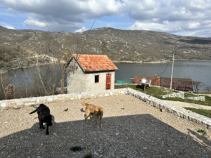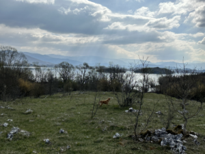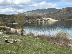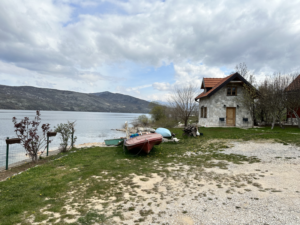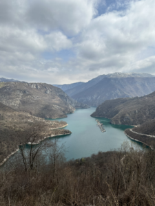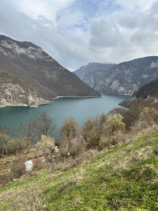 Die Landschaft verändert sich nur minimal. So wurde aus der schroffen Felslandschaft plötzlich das ein oder andere fruchtbare Tal, doch es ging weiter nach oben und am Horizont tauchten schneebedeckte Gipfel auf. Wieder eine Wegbiegung später wurde der 16 km lange Stausee in einem Canyon sichtbar, für den damals extra unser Zielort Pluzine an anderer Stelle wieder aufgebaut wurde. Das Camp das wir ansteuerten, hatte noch geschlossen und die Arbeiten für die Saison liefen auf Hochtouren. Aber es wurde uns erlaubt direkt unten am Fluss zu stehen und so faulenzen wir vor uns hin, sammeln Feuerholz und campieren am Bachlauf kurz bevor es in den Stausee übergeht.