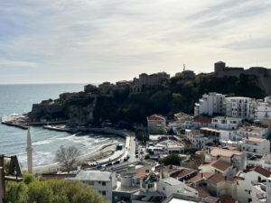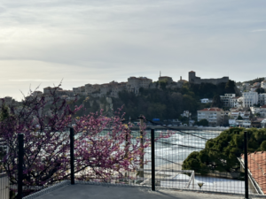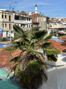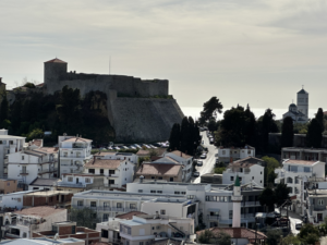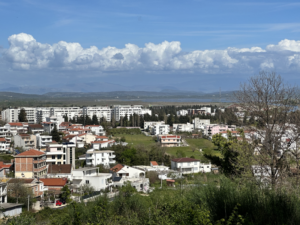 Keinen Kilometer später landen wir im Ort, gehen asphaltierte Wege, Hauptstraßen ohne Gehweg bergauf und bergab, Kilometer um Kilometer. Von der angekündigten Altstadt oder dem tollen Restaurant keine Spur, der Weg führt auch immer weiter ins Landesinnere statt zurück zur Küste. Sanne fängt langsam an zu maulen. Schließlich ist das alles für Luna mit ihrer Arthrose nicht so gut, etc. Seit über 1 Woche liegt sie uns in den Ohren, dass sie endlich wandern will und kaum ist man am wandern…. Nach einem weiteren Kilometer erhaschen wir einen Blick auf die (zumindest aus der Ferne) malerische Altstadt von Ulcinj. Immerhin für ein Foto reicht es.