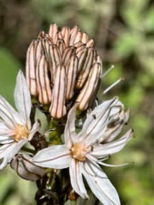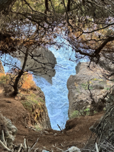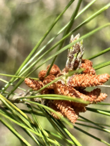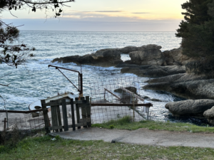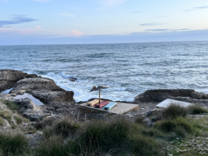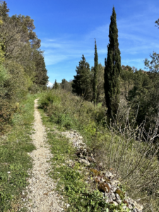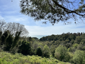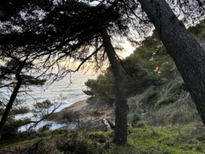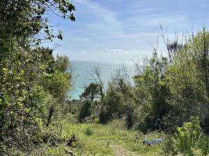 Der Weg führt durch einen Kiefernwald, vorbei an Orangen- und Feigenbäumen und eröffnet die ganze Zeit einen unglaublichen Blick auf die harsche, steile Küste und begleitet vom Meeresrauschen und den donnernden Wellen, die an die Steilküste schlagen. Es gab Gänseblümchen, Kamille, wilden Salbei – es war wie ein Spaziergang im Siebentischwald nur eben mit Meeresrauschen. Als wir an einer Weggabelung landen (Google Maps ist hier echt keine Hilfe, da kleine Wege nicht angezeigt werden, aber das wussten wir erst hinterher) gehen wir nach Google Maps die Fußgänger-Route nach rechts.