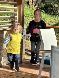 Knapp drei Stunden und je eine Kugel Eis später kommen wir doch endlich in besagtem Restaurant an. Ein Campari-Sprizz für die Erwachsenen und ein Orangensaft sowie der fantastische Blick auf das Meer entschädigen für den bisherigen Weg. Wir beschließen noch etwas zu essen bevor wir uns die „letzten Meter“ auf den Heimweg machen. Eva schließt Freundschaft mit einem zwei Jahre alten Jungen. Zuckersüß, wie die beiden Hand in Hand auf und ab marschieren. Irgendwie erinnert er uns mit seinen blonden Locken an Eva als sie zwei Jahre alt war. Als er aber gehen soll, will er Eva einfach nicht loslassen, denkt sich wohl – die nehm ich mit – aber nicht mit uns.